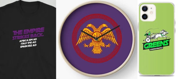 I’m very pleased to say that some of your ideas have made their way into the collection. I asked for your input on social media and you came up with great ideas. If you want to celebrate your love of Justinian or Belisarius then an Empire Strikes Back t-shirt could be yours. Or if you’ve been dying to show your support for the Green faction or the Blues but they won’t let you in the Hippodrome anymore then fear not because a Green or Blue iphone case or mouse mat or t-shirt could be yours. Or what about the most adorable item of all – a baby grow with porphyrogennitos on it. Come on, how could you resist?