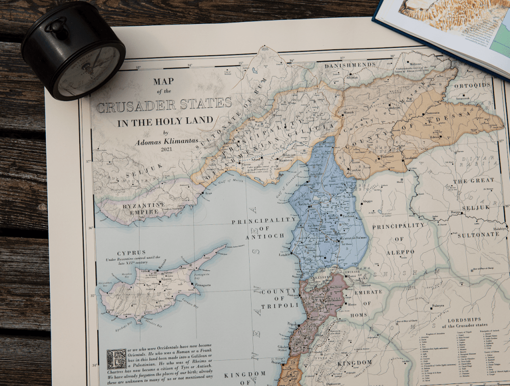 This beautiful map of the Crusader States has just been put on sale. Adomas, the artist, is offering 15% off any map at his store for podcast listeners. Just use the code Byzantium at his online store. mapklimantas.etsy.com